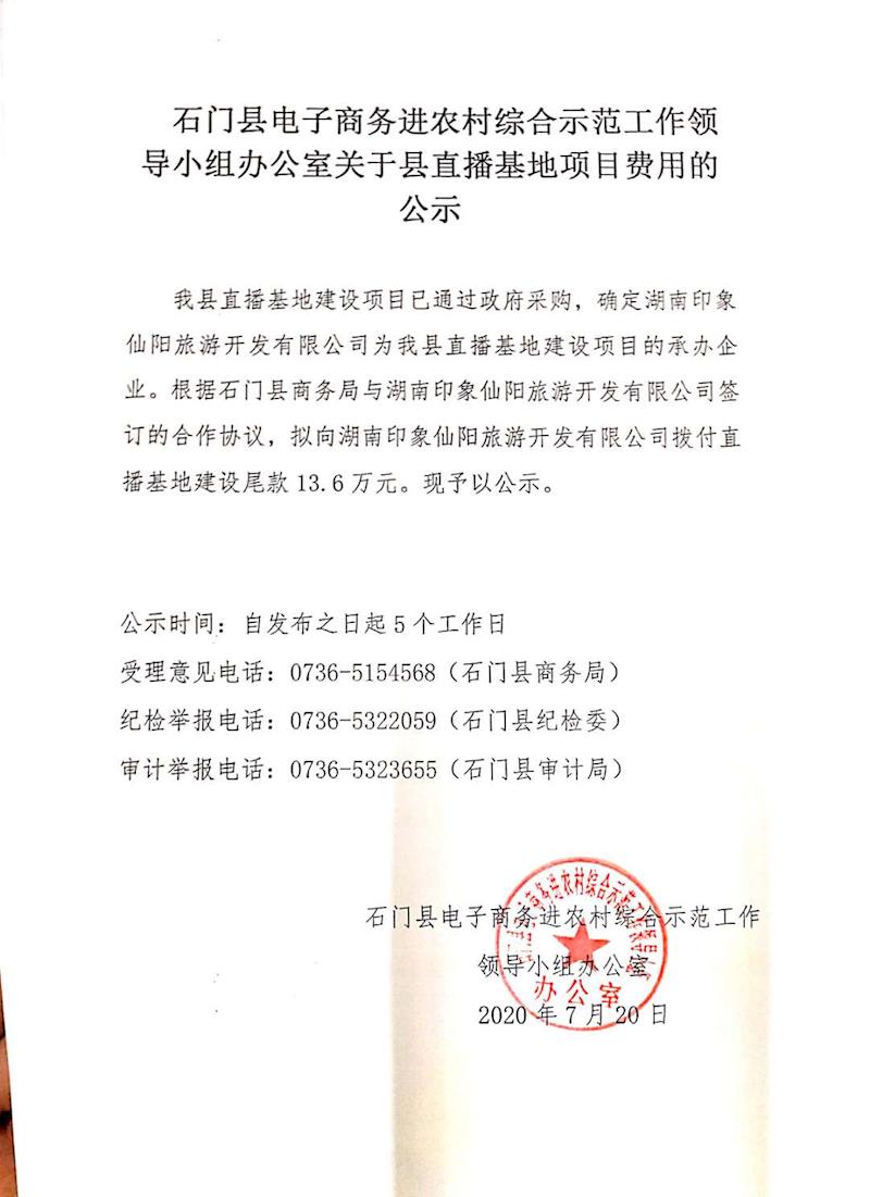 石门县电子商务进农村综合示范工作领导小组办公室关于拨付县直播基地项目费用的公示